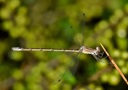 This is an image of a dragonfly perched on what appears to be a plant stem or leaf with green and black vegetation in the background, possibly indicating a natural habitat.