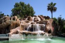 The image depicts an outdoor swimming pool complex set against a clear blue sky, featuring a man-made waterfall and palm trees in the background. The water is light green, indicating its freshness or cleanliness. There is no visible text on any signs or banners.