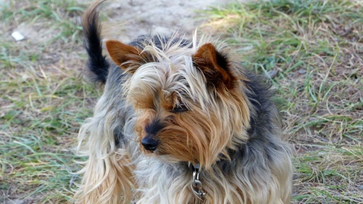A small, shaggy dog standing on grass in an outdoor setting, looking to its left with a focused expression.