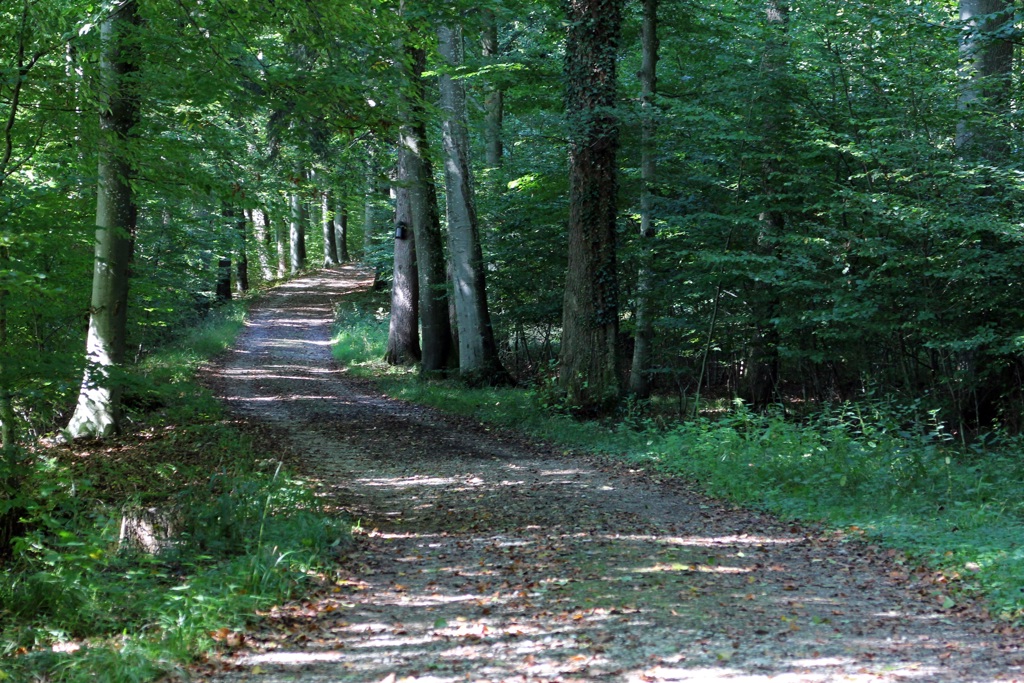 The image depicts a serene woodland scene with a sunlit path cutting through the middle of it. The path is lined with trees that cast long shadows on the ground, indicating the time might be early morning or late afternoon when the sun's angle creates such strong shadows.