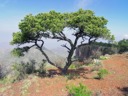 The image shows a tree growing on a rocky cliff or mountain top under a clear blue sky. The tree appears to be a variety of pine, with branches that splay out in multiple directions from its central trunk. The terrain around the tree is barren, suggesting a harsh or remote environment. There are no signs of human activity visible in the image.