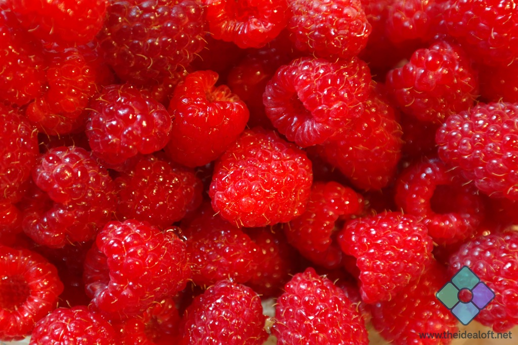 A close-up photograph of red raspberries, showing a cluster of berries with visible moisture and a soft focus blurring the background.