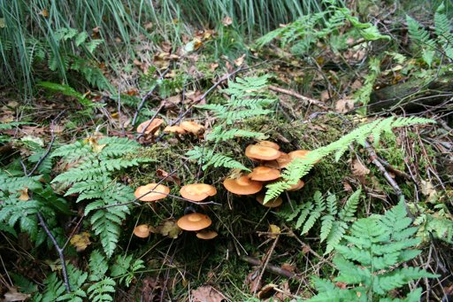 The image shows a forest floor lush with green ferns and moss, partially obscuring a cluster of small yellow mushrooms growing amidst the vegetation. The environment appears natural and untouched, suggesting an outdoor setting in a region with temperate rainforest conditions.
