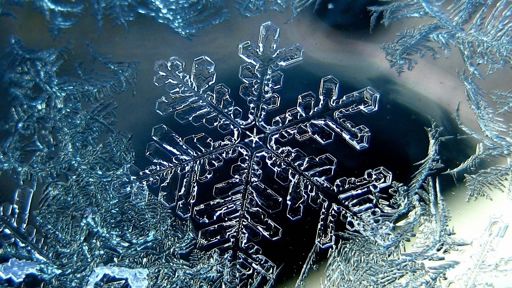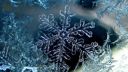 A close up of crystalline ice forming snowflakes against a dark background. The image captures the intricate, natural patterns of frozen water and its formation into a recognizable shape.