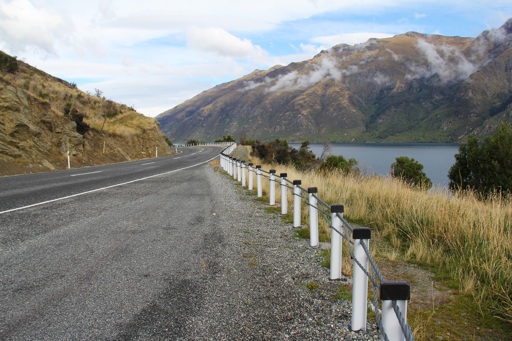 A two-lane highway leading to a body of water, possibly a lake, with mountains visible in the distance under a partly cloudy sky.