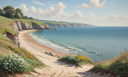 This is an illustration of a serene coastal scene, featuring a sandy beach with gentle waves lapping at the shore, surrounded by lush greenery and rocks in the distance.