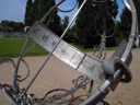 The image shows a metal sculpture or artwork that appears to be an abstract, decorative piece with intricate designs and possibly some form of measuring device integrated into its structure. The sculpture has a central vertical bar adorned with numbers and possibly letters or symbols, set against what could be an industrial background. It is placed on a grassy area in a park-like setting.
