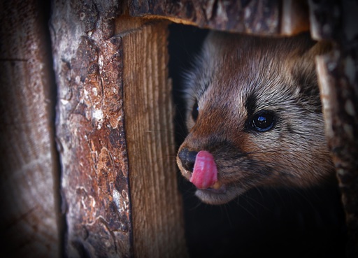 The image shows a red fox peeking out from an opening in what appears to be a wooden structure, possibly a cabin or hut with natural bark siding. The fox's fur is dark brown with white speckles, and its nose and mouth are visible as it looks upwards towards the viewer. The expression on the fox's face seems curious or alert.