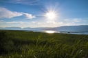 A serene landscape view under a clear blue sky, showing the sun shining brightly on the calm water and green grassy shore.