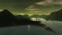 An image of a fantastical landscape featuring a serene lake nestled amidst rocky cliffs and surrounded by lush vegetation under a neon green sky, possibly indicating a science fiction or fantasy setting.