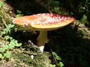 This image shows a red and white mushroom growing on a forest floor, surrounded by greenery such as ferns and small bushes. The sunlight filters through the canopy, creating dappled lighting patterns that highlight the mushroom's colors.
