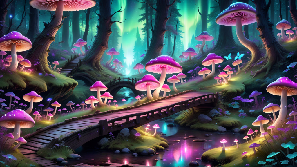 A surrealistic forest scene featuring an abundance of pink and purple mushrooms, a winding path, a small bridge, and a river reflecting the ethereal glow from the trees.
