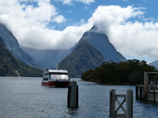 This is an image of a cruise ship docked in a harbor, surrounded by mountains and clouds. The sky appears to be blue with some clouds scattered across it.