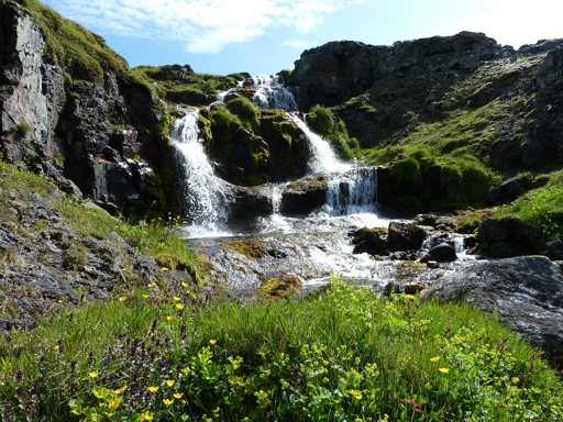 The image depicts a serene, natural landscape featuring multiple waterfalls cascading down rocky cliffs and hillsides with patches of greenery and flowers blooming amidst the stones and plants. The scene conveys tranquility and is likely safe for all audiences.