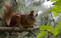 The image shows a small brown squirrel perched on a tree branch. The squirrel is facing to the left and appears to be eating from a tree, with its front paws holding onto a piece of food it has picked up.