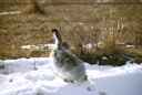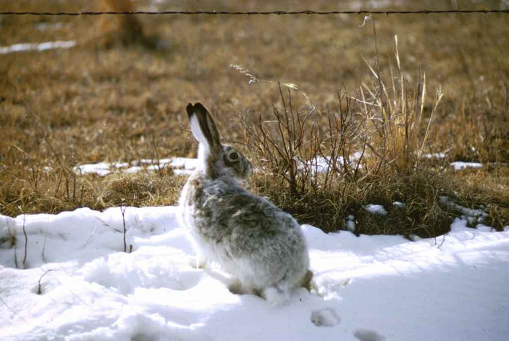 An image of a small, light brown rabbit standing in a field covered with snow.