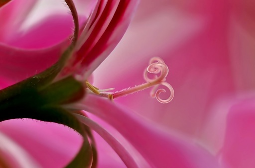 Close up of a pink flower's petal, revealing intricate details and possibly an insect resting on it.