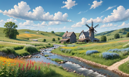 A picturesque, idyllic countryside scene featuring a windmill and quaint cottages alongside a serene river, with a backdrop of rolling hills under a clear blue sky.