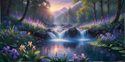 A serene, idyllic image depicts a tranquil forest scene at sunrise or sunset, with a clear river flowing through lush greenery and purple flowers blooming near the water's edge.