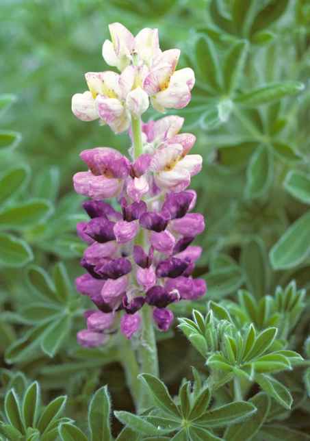 The image depicts a single purple and yellow wildflower, likely an Iris, growing in a natural environment with green foliage and other plants around it.
