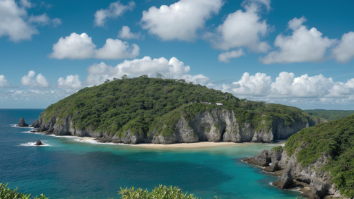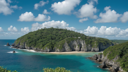 This is an image of a tropical beach island surrounded by vibrant blue waters. The island appears to be uninhabited, with no people visible in the picture. It's a clear day with some clouds scattered across the sky, and the vegetation on the island suggests it might be part of a rainforest ecosystem.
