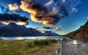 Stunning mountainous landscape with cloudy sky during sunset or sunrise, overlooking lake and river.