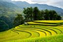 The image depicts a traditional rice terrace in a mountainous region, possibly in Southeast Asia. It shows steep terraced fields carved into the mountainside with a few trees scattered across the landscape. Two people are visible working on the field, suggesting agricultural activity. The sky is overcast and it appears to be either dawn or dusk due to the soft lighting conditions. The overall scene conveys a sense of rural life and the practice of sustainable farming in mountainous terrains.