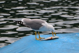A seagull is perched on a blue floating platform, eating a fish. The water around it has small ripples indicating movement.