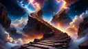 This image portrays a fantastical scene set high atop a tall, spiral staircase. The staircase is made of large stone steps and spirals upwards to an unseen destination. At the top, there appears to be a doorway or entrance that leads beyond into a mysterious, floating landscape. This surrealistic depiction evokes feelings of curiosity, wonder, and intrigue.