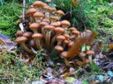 The image shows several mushrooms growing in a natural setting, possibly on a forest floor or along a woodland trail. The mushrooms are clustered and appear to be of the type that can grow in groups or 'fairy rings' as they are sometimes called.