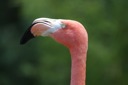 The image shows a flamingo, which is a large wading bird known for its long neck and vibrant pink coloration. The bird's head is bent downwards in the frame, giving it an attentive or curious expression. Flamingos are commonly found in wetland environments around the world and are a symbol of grace and beauty.