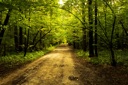 A tranquil forest scene, showing a dirt road or trail lined on both sides with trees. The sunlight filters through the canopy creating a serene atmosphere.