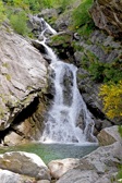 The image shows a serene natural scene featuring a small waterfall cascading down rocks. The water appears to be clear and the surrounding area looks lush with vegetation, possibly indicating a forest or mountainous region. There are no visible people or animals in the immediate vicinity of the falls.
