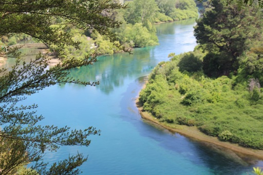 The image shows a serene landscape featuring a winding river with clear blue waters. The surrounding vegetation includes lush greenery, grassy areas, and a variety of trees. On either side of the river, there are dense forests, and the overall scene suggests a tranquil and pristine natural environment.