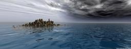 A stormy sky hovers over a city island amidst water, creating a dramatic scene.