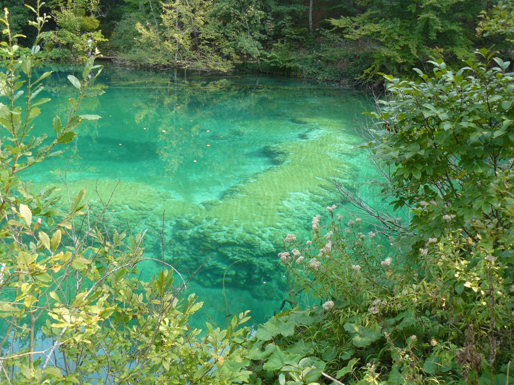 A natural body of water, likely a river or lake, exhibiting distinct green and blue hues due to the presence of algae, minerals, and possibly moss growing on rocks. The surrounding environment is lush with trees and plants, suggesting this could be a forested area or protected nature reserve.