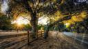 Sunset photograph capturing warm light illuminating the trunks of oak trees and the silhouette of fencing and distant foliage.