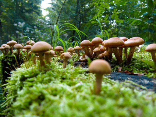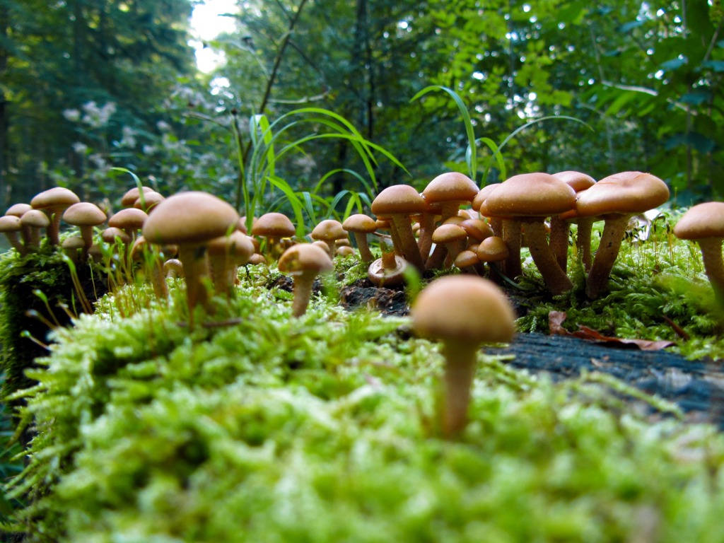 A lush green forest scene filled with various types of mushrooms growing on patches of moss on the ground and fallen trees.