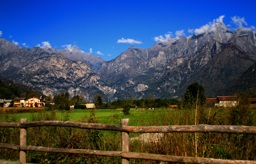 A beautiful landscape scene featuring lush green fields, wooden fences, and majestic mountains in the background under a clear blue sky with few clouds.