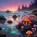 A fantastical beach scene at sunset, featuring rocks with large vibrant mushrooms sprouting from them.