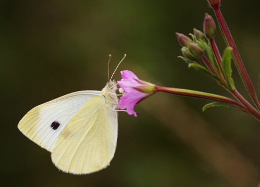 The image captures a vibrant scene of nature, featuring a butterfly perched on a pink flower bud. The butterfly's wings display hues of white and yellow, contrasting beautifully with the pink petals of the flower.