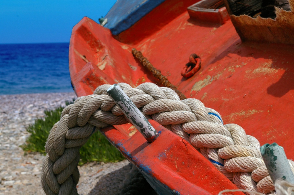 This image depicts a vibrant scene at a beach. In the foreground, there is a red boat with a white hull and trim, resting on the sandy shore. The boat appears to be old, possibly used for fishing. It has some rust spots visible on its side. A rope with a knot on top of it is attached to the front of the boat. Behind the boat, there's clear blue water that meets the sky in a horizon line. On the right, part of a green plant is visible, indicating that vegetation grows near the shore. The overall atmosphere is serene and suggests a peaceful day at the beach.
