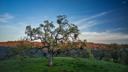 This image shows a picturesque rural scene during what appears to be either sunrise or sunset, given the soft and warm hues in the sky. A solitary, gnarled tree with twisted branches dominates the foreground on the left side of the image. The background features rolling hills that gradually fade into a hazy horizon. There are no visible texts or inscriptions in the image. It seems to be a peaceful and serene landscape.