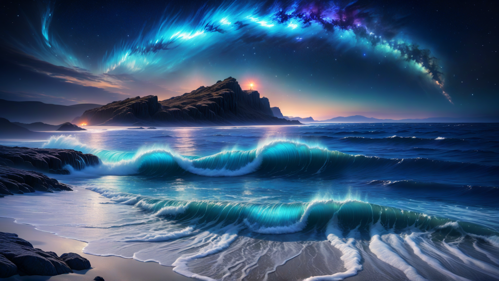 A beautiful night scene of a beach where the sunrise is just beginning to peek over the horizon and light up the sky. The water is dark blue, with waves crashing onto the shore. A large rock sits in the center of the photo, surrounded by a multitude of stars that seem to be reaching towards it from across the ocean.