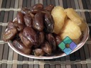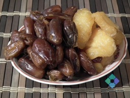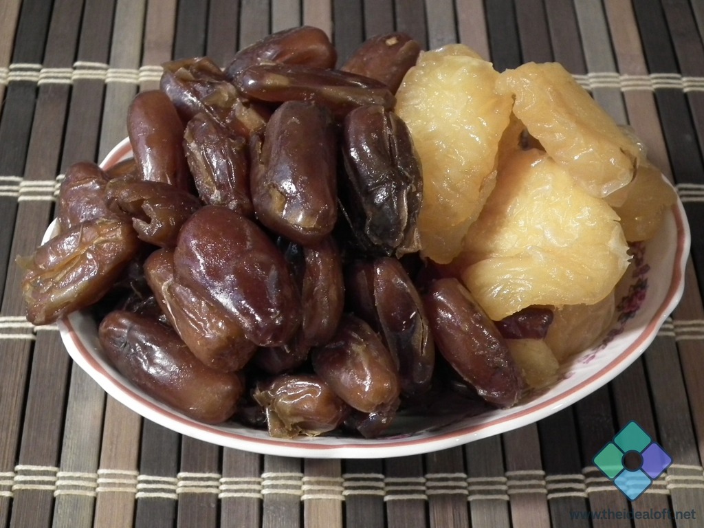 A bowl of dates and fruits, possibly for a meal or dessert, set on a woven placemat with a bamboo table underneath.