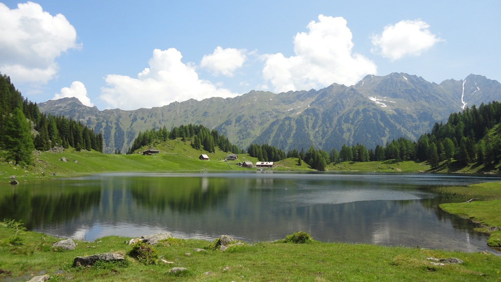 A tranquil alpine lake surrounded by grassy meadows and majestic mountains under a clear blue sky.