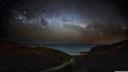 A nighttime photograph of the Milky Way galaxy viewed from Earth, showing thousands of stars and nebulas against the dark sky.