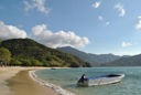 A picturesque beach scene during daylight hours, featuring a blue boat on shore with clear skies and calm waters.