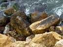 The image depicts a rocky shoreline with various types of rocks and some algae growth on them. The water appears choppy with waves crashing against the shore, suggesting a coastal location possibly subject to strong tides or currents. The overall color palette is muted with earthy browns, grays, and greens dominating the scene.