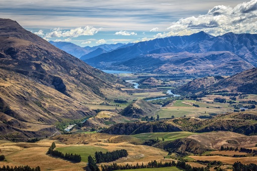 A scenic mountainous landscape featuring valleys, hills, and a river meandering through the terrain.